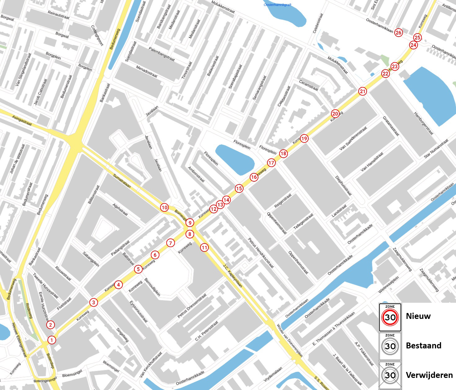 Het feit dat de Korreweg een fietsstraat wordt, betekent ook dat 50 km/h niet langer een passende maximumsnelheid is. De maximumsnelheid gaat daarom terug naar 30 km/h. In dit besluit gaat deze verlaging van de maximumsnelheid om het stuk Korreweg tussen het kruispunt Boterdiep-Korreweg en het kruispunt Korreweg - Oosterhamriklaan. Bij de constructie van de nieuwe Gerrit Krolbrug wordt de zone uitgebreid aan de noordoostzijde. De Korreweg is een lange, rechte en brede weg. Deze breedte is nodig voor de grote aantallen fietsers met verschillende snelheden, bussen en logistiek verkeer. Het gestrekte en brede karakter van de Korreweg kan echter hogere snelheden van gemotoriseerd verkeer tot gevolg hebben. Om dit in te perken krijgt de weg een visuele versmalling door de indeling in twee rijbanen met een middenstrook in een andere kleur. Ook worden op meerdere kruispunten middengeleiders toegepast. Deze geleiders zorgen ervoor dat de weg uitbuigt en dat de inhaallengte verkort wordt. Verder worden er op verschillende kruispunten ook kruispuntplateaus (drempels) toegepast. De nieuwe inrichting, met verhoogd parkeren en een grotere hoeveelheid groen, versmalt het wegbeeld visueel en daarmee wordt op de Korreweg het verblijfskarakter benadrukt. Omdat de weg ook de ruggengraat is voor gedeeltes van de omliggende wijken worden er op gerichte plekken ook zebrapaden in stand gehouden. Een aantal zebrapaden zullen vervallen. De overgebleven zebrapaden, die in een 30 km/h-zone verkeerskundig weliswaar niet per sé nodig zijn, zorgen voor toegankelijke oversteekplaatsen (een nadrukkelijke wens van bewoners en belanghebbenden) en sluiten grotendeels aan bij belangrijke functies van de omliggende buurten, zoals een winkel en een school.