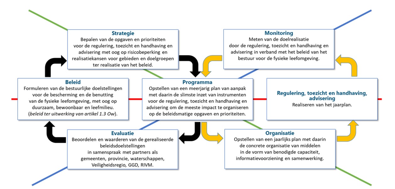 De uitvoerings- en handhavingsstrategie beschrijft op welke wijze de gemeenten en provincie door middel van de basistaken uitvoering willen geven aan de meer strategische ambities die in hoofdstuk 2 staan verwoord.6 De uitvoerings- en handhavingsstrategie heeft daarmee haar plek in een groter geheel van beleid vanuit de deelnemers; deze relatie wordt verduidelijkt in de beleidscyclus (zie bijlage 1).