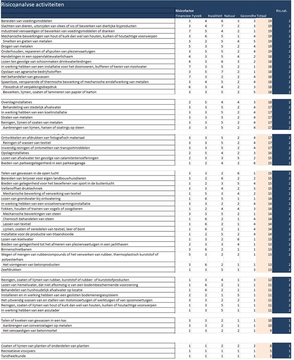 Deze aspecten leiden met een weging van het potentieel nadelige effect tot een risicocategorie per branche. Het totaal van de risicofactoren leidt tot een risicoscore, waarbij een indeling is gemaakt in: