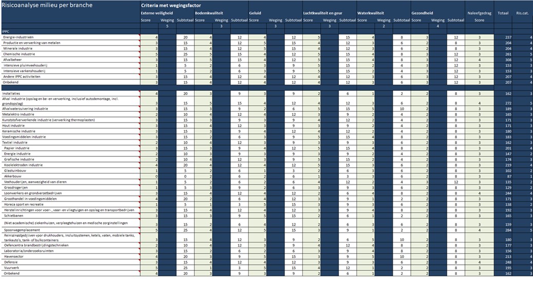 De bedrijven zijn per groep gerubriceerd naar branches. Dit betreft: 1) bedrijven met een IPPC-installatie, 2) bedrijven met vergunningplichtige milieubelastende activiteiten en 3) bedrijven met informatie- en meldingsplichtige milieubelastende activiteiten. Ieder van de branches is gescoord (van waarde 1 zeer lage kans tot waarde 5 zeer hoge kans) op de volgende milieuaspecten. 52
