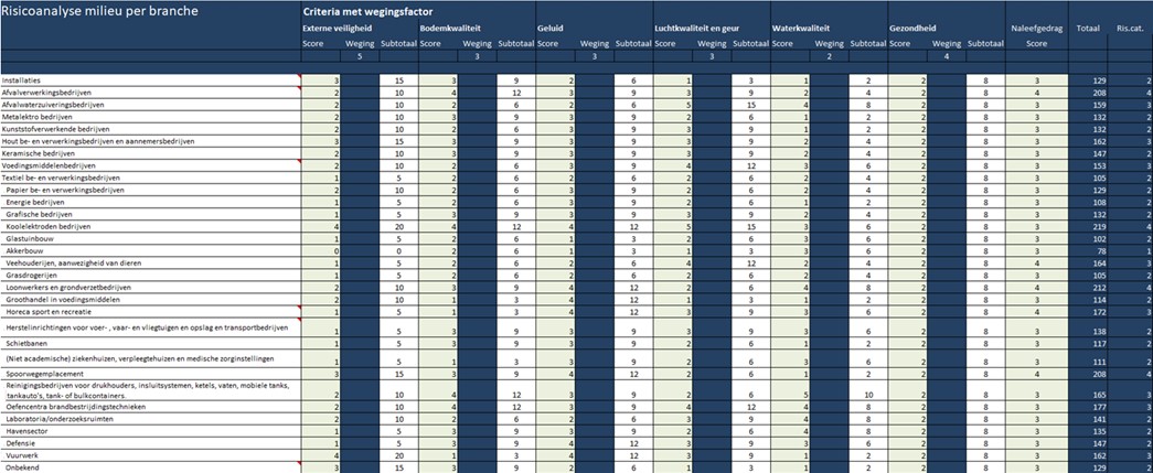 De kans op niet naleving van de branche waarin het bedrijf actief is.48 Om het risico van de branche te bepalen, worden milieuaspecten ten opzichte van elkaar gewogen. Te weten: