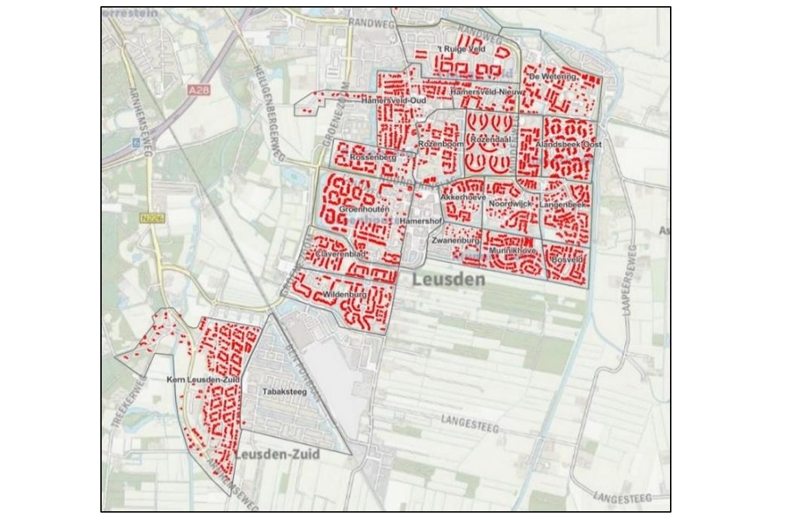 Bij het openen van de applicatie zijn alle woningen die deel mogen nemen rood gekleurd. Dit zijn de grondgebonden woningen in particulier eigendom met een energielabel C tot en met G. Door het klikken op een woning, en het invullen van relevante gegevens, wordt de woning ‘groen’ en daarmee onderdeel van de legalisatie van de ontheffing van de gemeente.