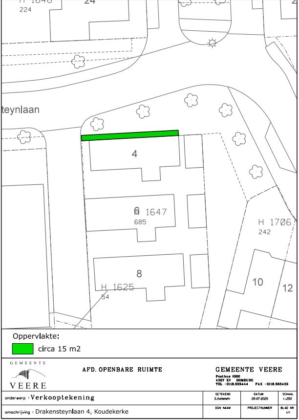 De gemeente Veere heeft het voornemen om een groenstrook, gelegen nabij de Drakensteynlaan 4 te Koudekerke, thans nog deel uitmakende van kadastraal bekend gemeente Valkenisse, sectie H nummer 2618, ter grootte van ongeveer 15 m² te verkopen en te leveren aan de aangrenzende perceelseigenaar. De te verkopen groenstrook is in het groen weergegeven op bijgaande verkooptekening.