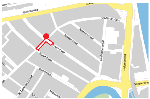 De camera wordt op de kruising van Spoorstraat en Snaarmanslaan, ter hoogte van Spoorstraat 64, gemonteerd waarbij cameratoezicht is binnen het hieronder aangewezen rode gebied.
