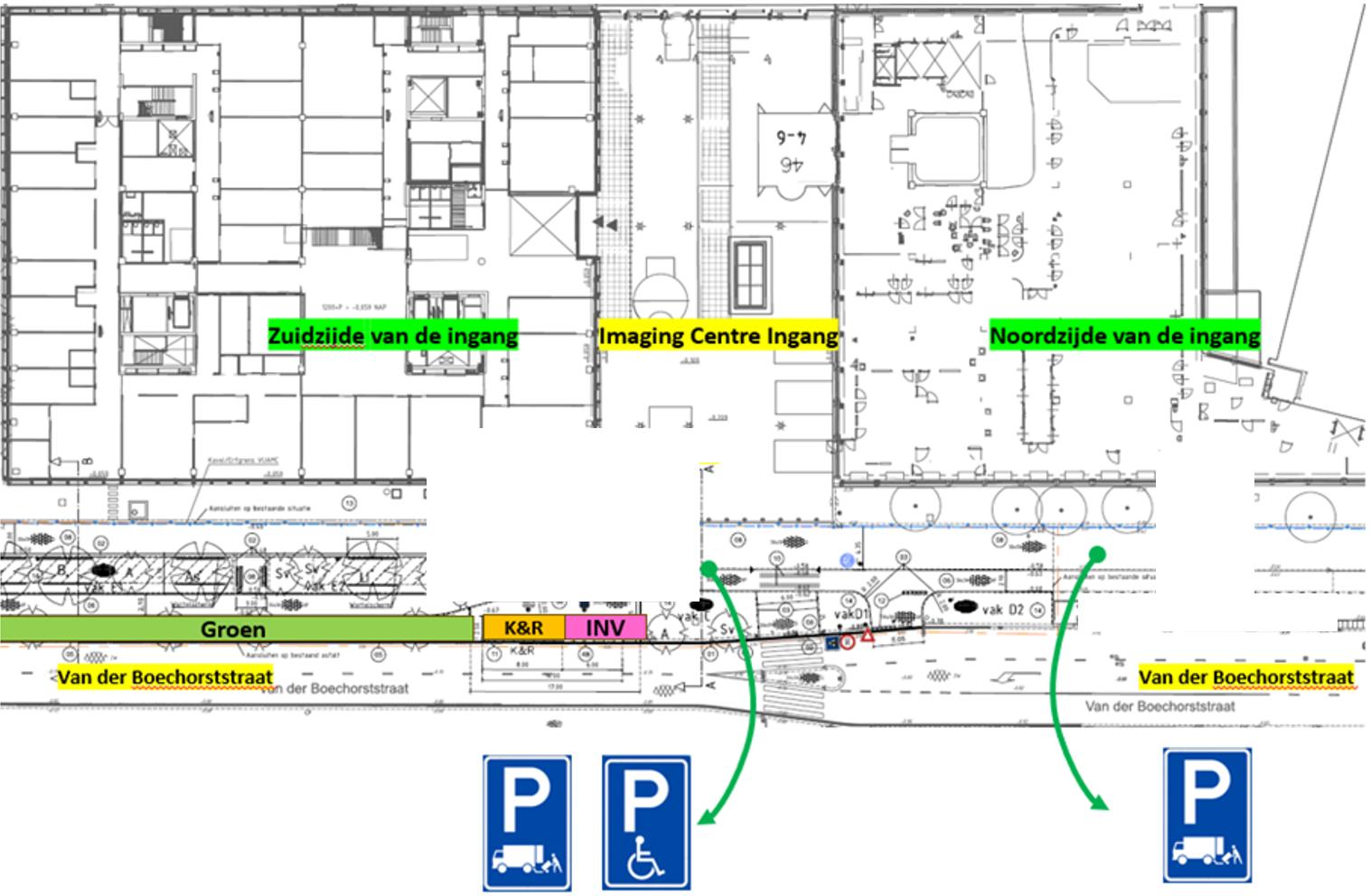bij het Amsterdam UMC Imaging Center voorheen reguliere parkeerplakken aanwezig waren;