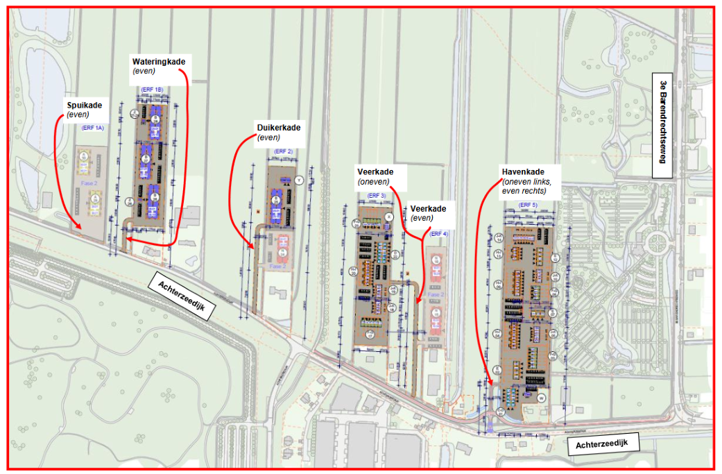 Tekening behorende bij het besluit tot vaststelling van de straatnamen Spuikade (erf 1A), Wateringkade (erf 1B), Duikerkade (erf 2), Veerkade (erf 3 en 4)en Havenkade (erf 5), zaaknummer GV 2025-007413