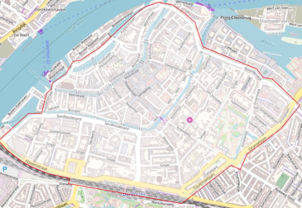 Het gebied binnen de wijk Centrum dat wordt begrensd door de straten: Oranjelaan, Toulonselaan, Burgemeester de Raadtsingel, Havenstraat, Korte Parallelweg, Wilgenbos, Achterhakkers, Prinsenstraat, Lange Geldersekade, Engelenburgerbrug, Nieuwe Haven, Kuipershaven, Palingstraat, Boomstraat, Torenstraat en Noordendijk, de genoemde wegen, oevers en aanwezige knooppunten van het openbaar vervoer daarbij inbegrepen.