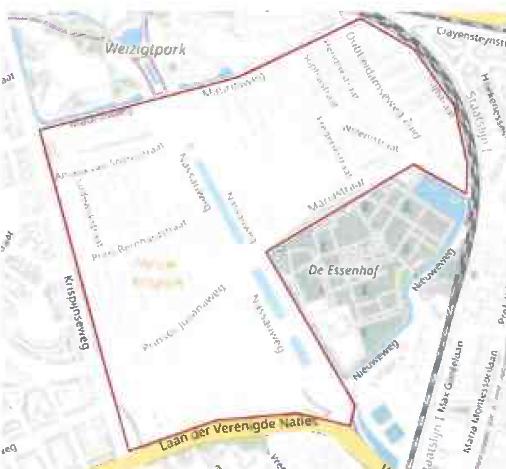 Het gebied binnen de wijk Nieuw-Krispijn dat wordt begrensd door de straten: Mauritsweg, Tulpstraat, Violenstraat, Mariastraat, Nassauweg, Laan der Verenigde Naties, Krispijnseweg, de genoemde wegen, oevers en aanwezige knooppunten van het openbaar vervoer daarbij inbegrepen.