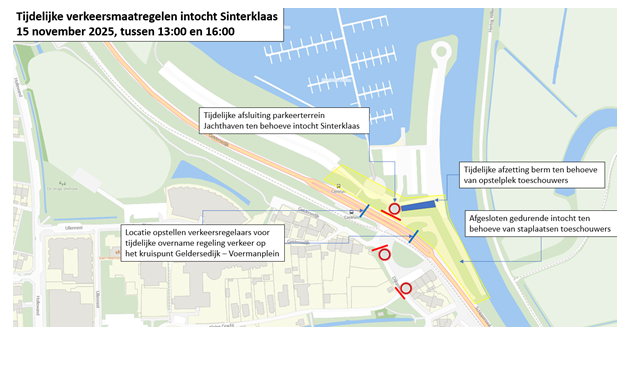 dat na de aankomst in de jachthaven, door Sinterklaas en de toeschouwers, de Geldersedijk overgestoken moet worden om bij de binnenstad te komen;