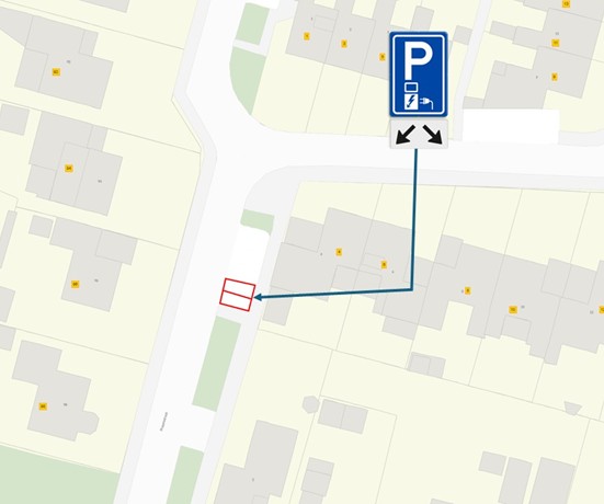 1. Door middel van het plaatsen van het bord E8c van bijlage 1 van het Reglement Verkeersregels en Verkeerstekens 1990 met een onderbord (OB504) die met twee pijlen aangeeft op welke vakken het betrekking heeft, twee parkeerplaatsen te reserveren ten behoeve van het opladen van elektrische voertuigen op de volgende locatie:
