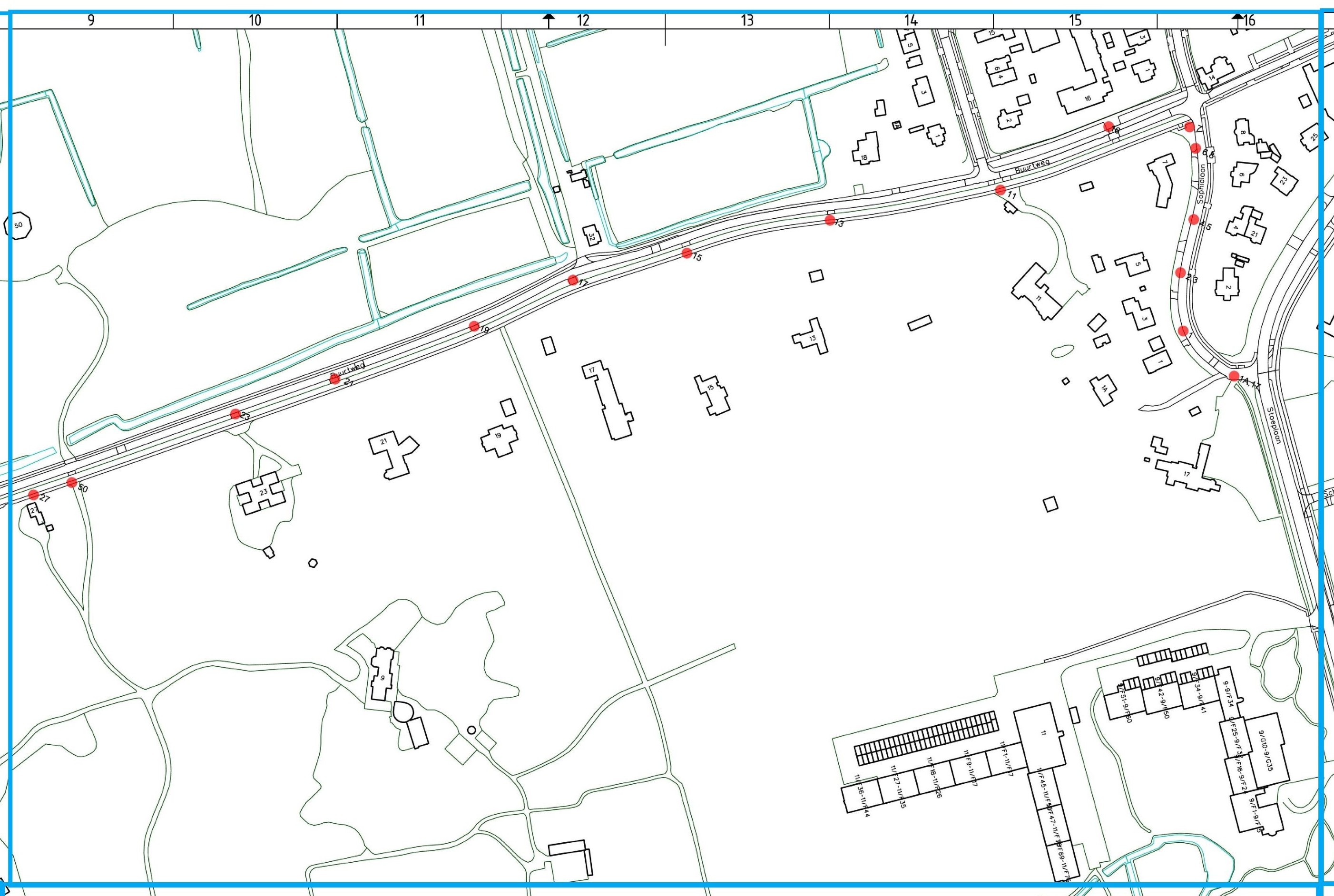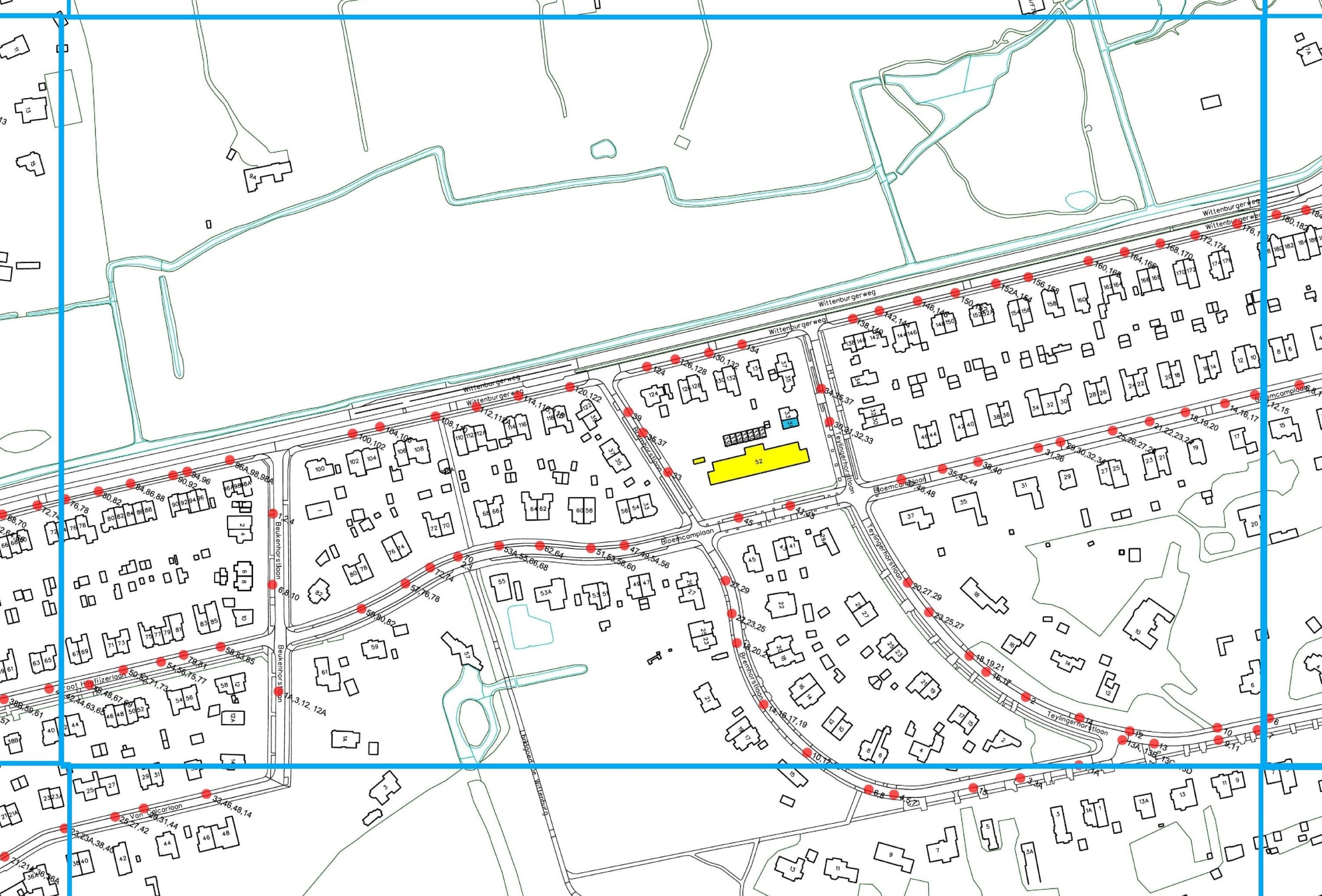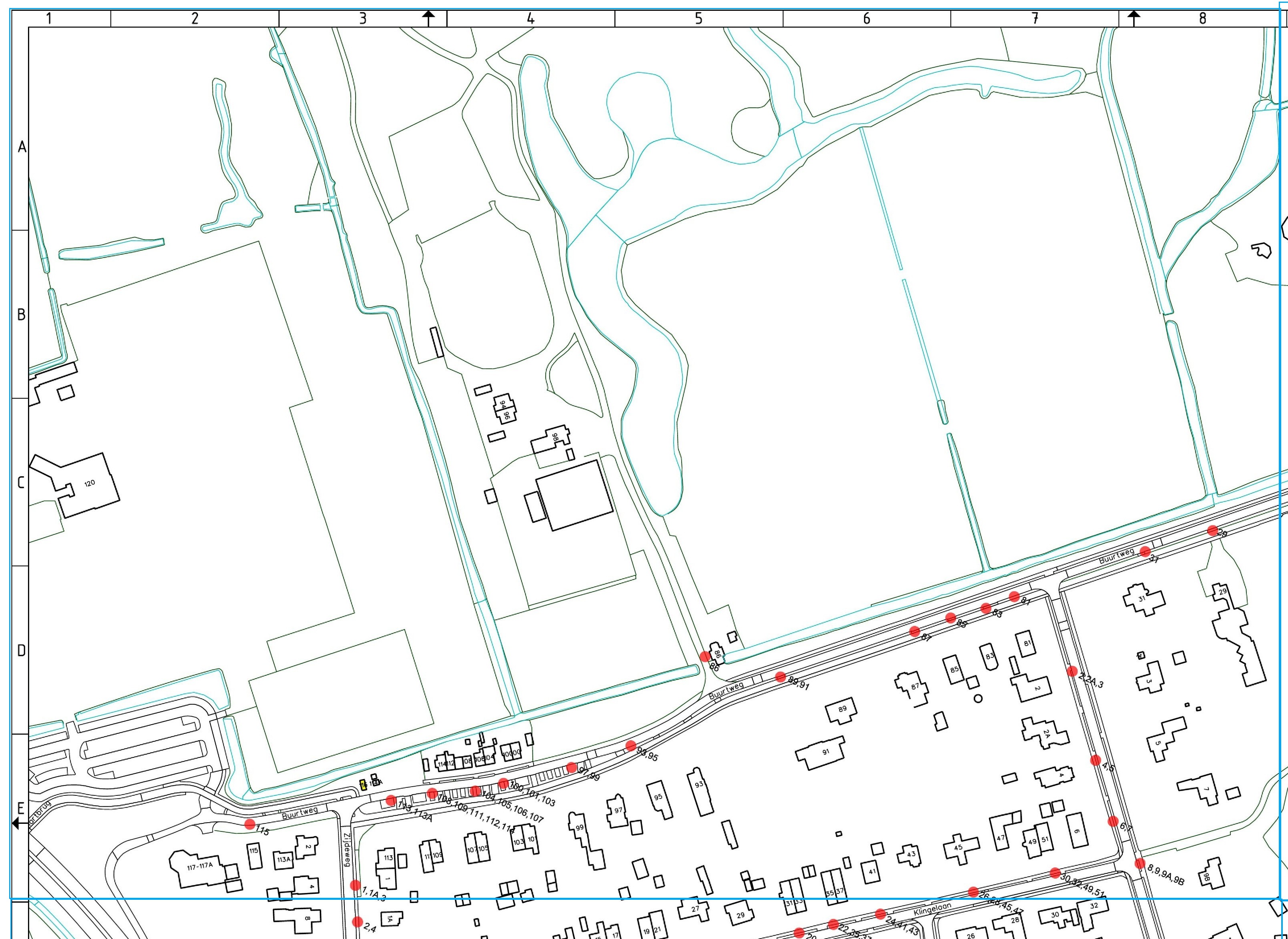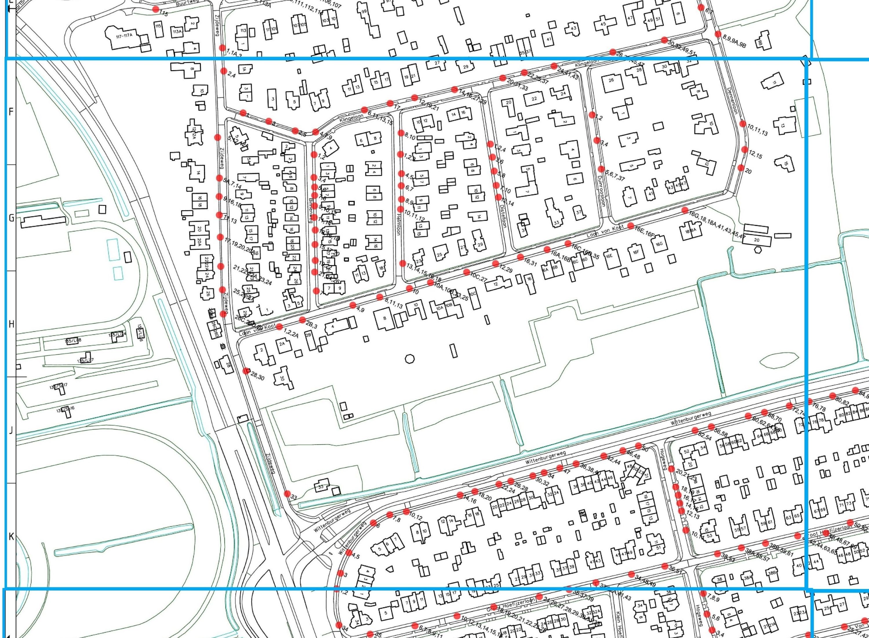 Voor betere leesbaarheid van details worden delen van de overzichtstekening waar panden met (huis)nummers voorkomen uitvergroot getoond. Deze delen worden hier omrand met turkooise lijnen.