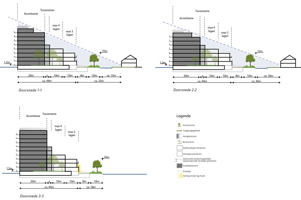 • De overgangszone blijft minimaal 2 bouwlagen onder de zichtlijn met een maximale bouwhoogte van 6 bouwlagen;