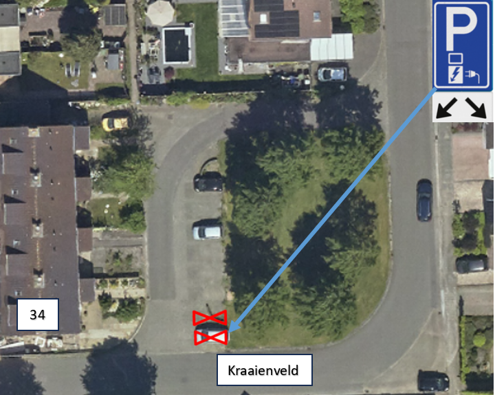 We hebben ook geconstateerd dat aan beide zijden van de parkeerstrook een betonnen muurtje staat. Op de verharding, tussen het muurtje en de doorgaande rijbaan van het Kraaienveld, wordt veelvuldig geparkeerd. Door deze muurtjes te verwijderen kunnen we enerzijds een extra parkeervak realiseren. Anderzijds kunnen we de laadpaal zo bij de twee buitenste parkeervakken in de parkeerrij plaatsen. Dit verduidelijkt de verkeerssituatie.