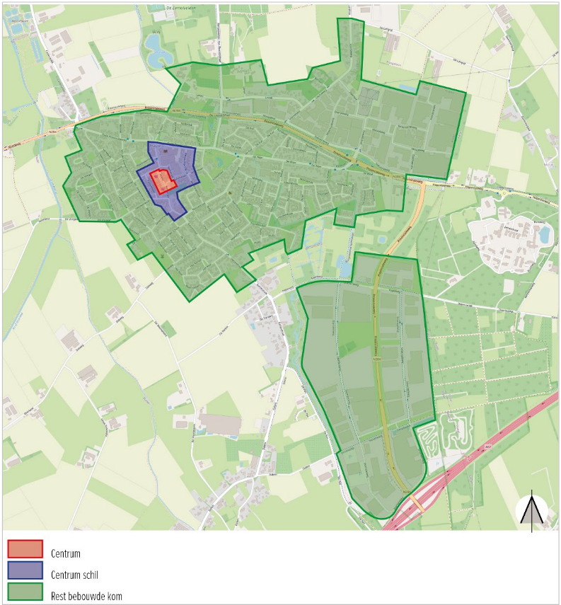 In de kern van Hapert wordt vanwege de recent ingestelde blauwe zone ook rekening gehouden met een centrum en een schil centrum daar omheen. De rest van de bebouwde kom valt onder ‘rest bebouwde kom’. De gebiedsindeling is weergegeven in Figuur 2.