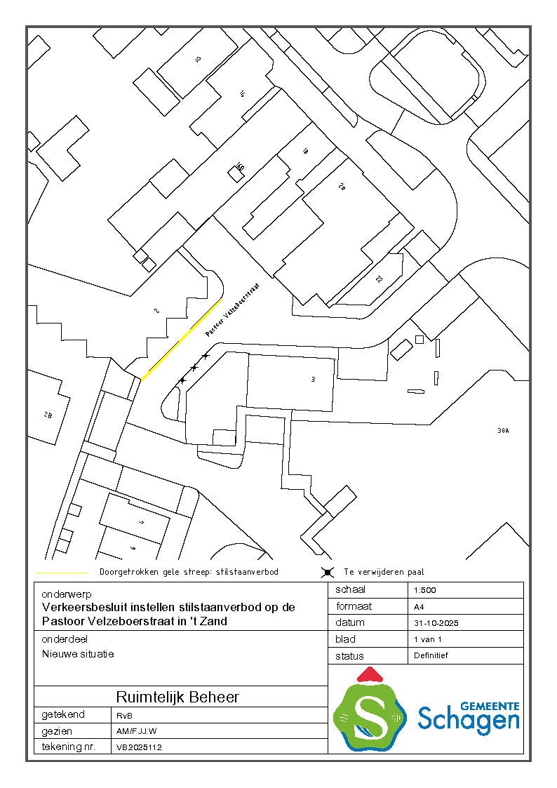Binnenkort komt er een pakketautomaat op de Pastoor Velzeboerstraat te staan. Om te voorkomen dat er aan weerszijden van de Pastoor Velzeboerstraat wordt geparkeerd, brengen we een stilstaan verbod aan de noord-westzijde van de weg aan. Hiermee willen we voorkomen dat de doorstroming van het verkeer in gevaar komt. Om de verkeersveiligheid en toegankelijkheid op dit punt te behouden wordt voorgesteld een gedeeltelijk verbod om stil te staan, doorgetrokken gele streep, aan de noord-westzijde van de Pastoor Velzeboerstaat aan te brengen. Hiervoor nemen we een verkeersbesluit.