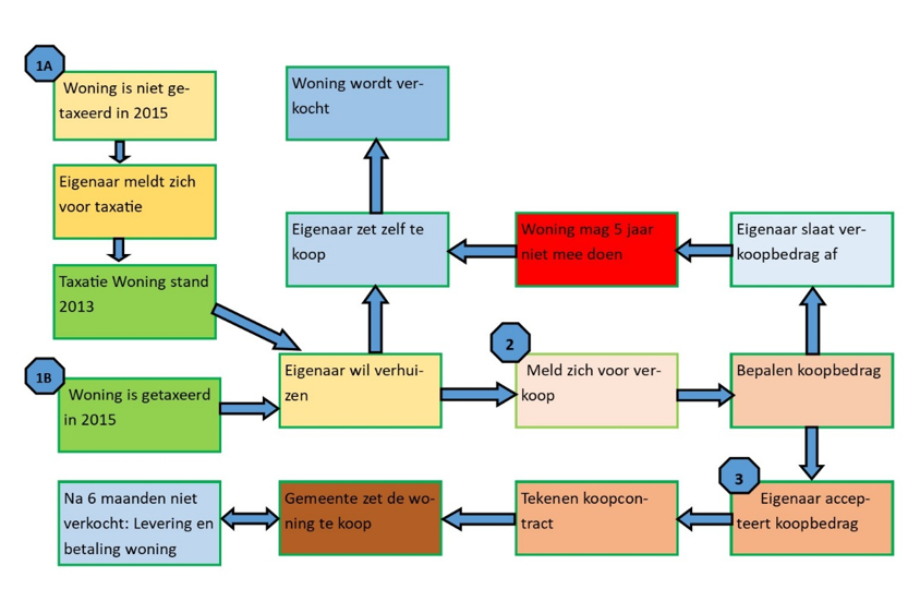 De bewoner krijgt een vaste, gegarandeerde verkoopprijs die in een koopovereenkomst wordt vastgelegd. Hierdoor heeft de bewoner geen prikkel meer om de woning tegen een zo hoog mogelijke waarde te verkopen. Daarom is het noodzakelijk dat de gemeente zelf de verkoop ter hand neemt.