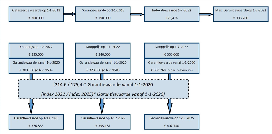 De garantiewaarde vanaf het moment van koop bedraagt 95% van de koopprijs (transactiebedrag) van de woning, met een maximum van de op het verkoopmoment geldende garantiewaarde (conform de berekening van de Moerdijkregeling).