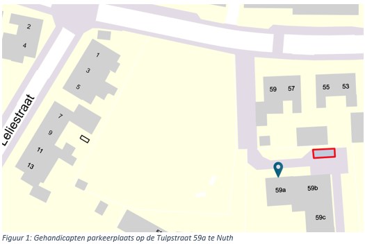 Uit oogpunt van het in stand houden van de weg en het waarborgen van de bruikbaarheid daarvan, en het zoveel mogelijk waarborgen van de vrijheid van het verkeer (artikel 2 Wegenverkeerswet 1994 lid 1), is het gewenst in de Tulpstraat t.h.v. 59a te Nuth een individuele invalidenparkeerplaats aan te leggen.