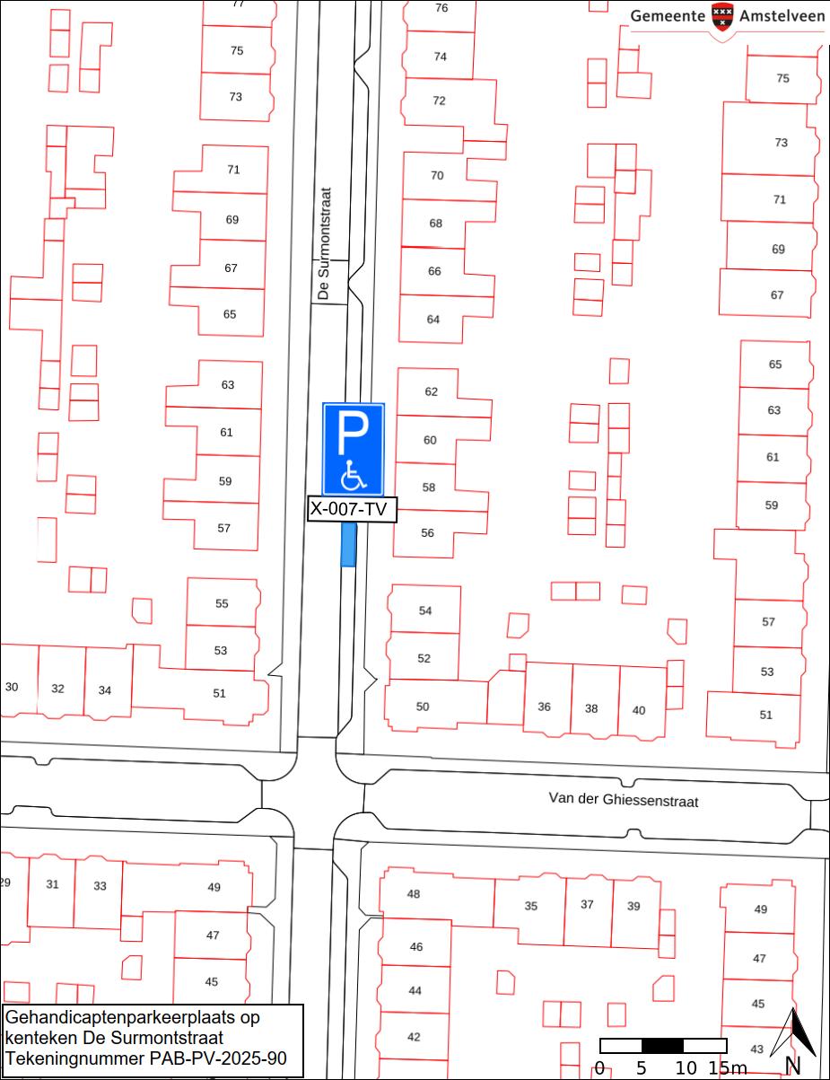 Burgemeester en wethouders van Amstelveen besluiten het parkeren te verbieden op een parkeerplaats in De Surmontstraat, zoals aangegeven op tekening PAB-PV-2025-90, met uitzondering van het voertuig met het kenteken X-007-TV (gehandicaptenparkeerplaats).