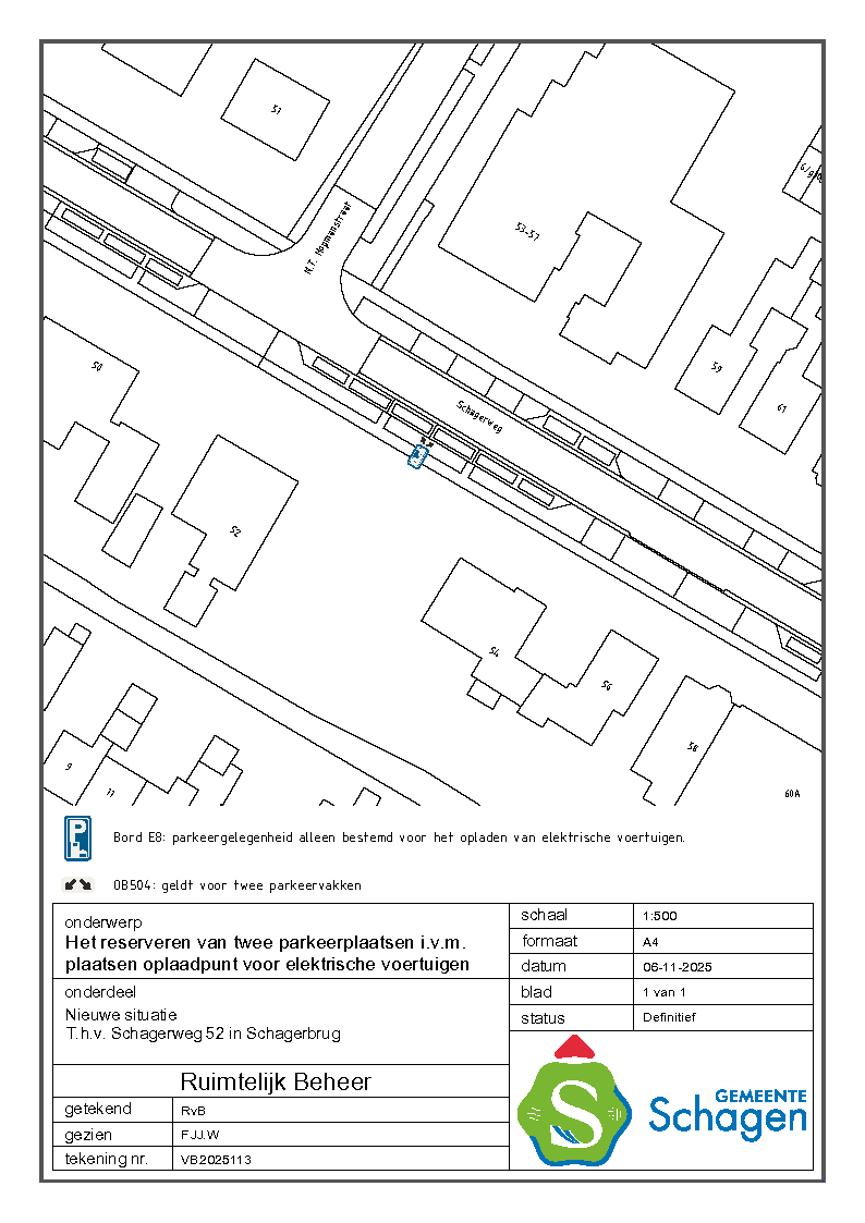 Gemeente Schagen- Verkeersbesluit reserveren van 2 parkeerplaatsen voor het opladen van elektrische voertuigen nabij Schagerweg 52, Schagerbrug.