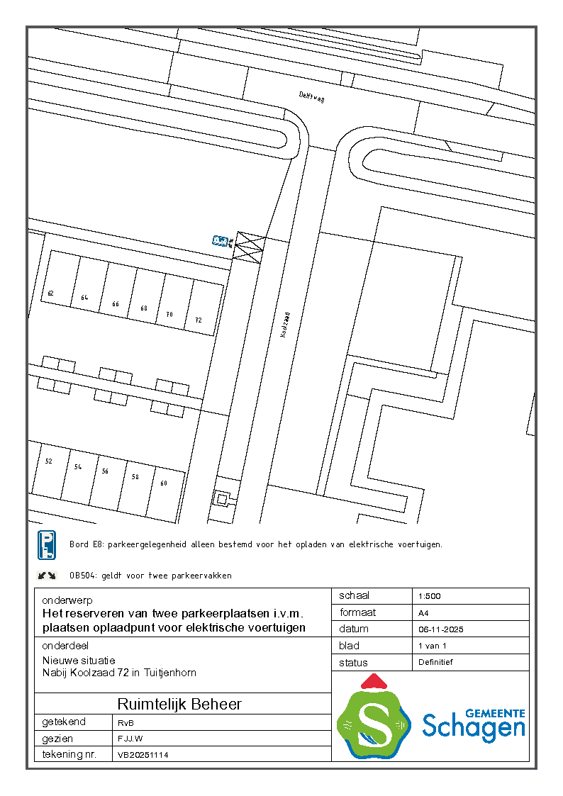 Gemeente Schagen- Verkeersbesluit reserveren van 2 parkeerplaatsen voor het opladen van elektrische voertuigen nabij Koolzaad 72, Tuitjenhorn.
