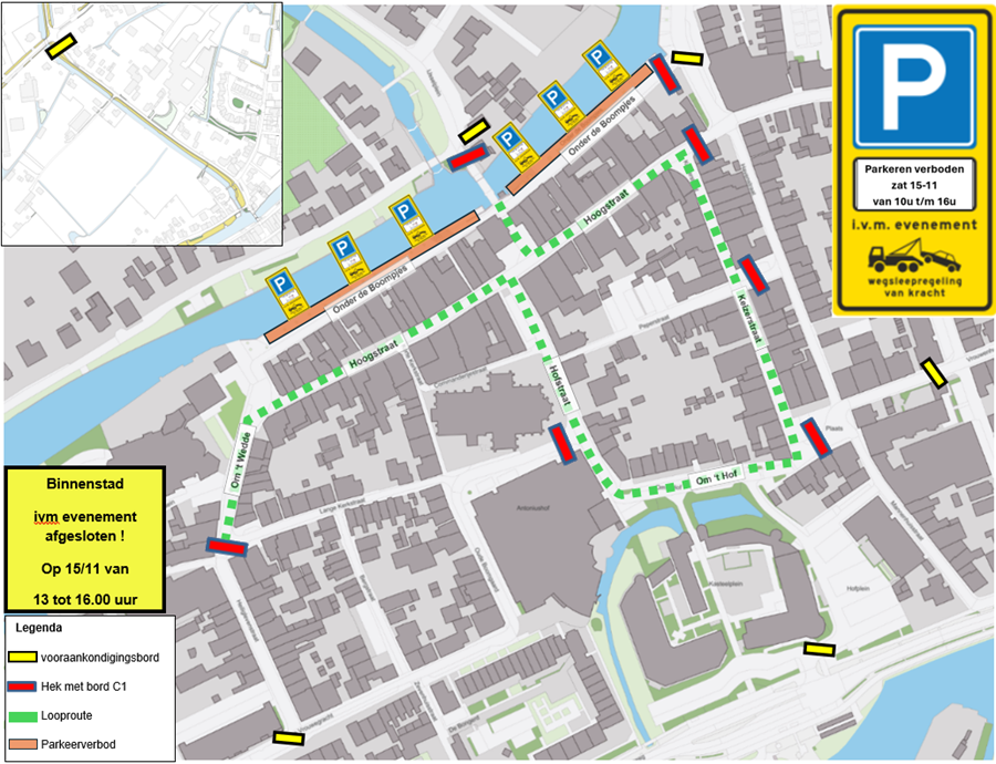 Om de toegankelijkheid en veiligheid van toeschouwers te waarborgen zijn bijkomende parkeerverboden voor voertuigen ingesteld bij de volgende locatie op zaterdag 15 november van 10:00 uur tot zaterdag 15 november 16:00 uur;