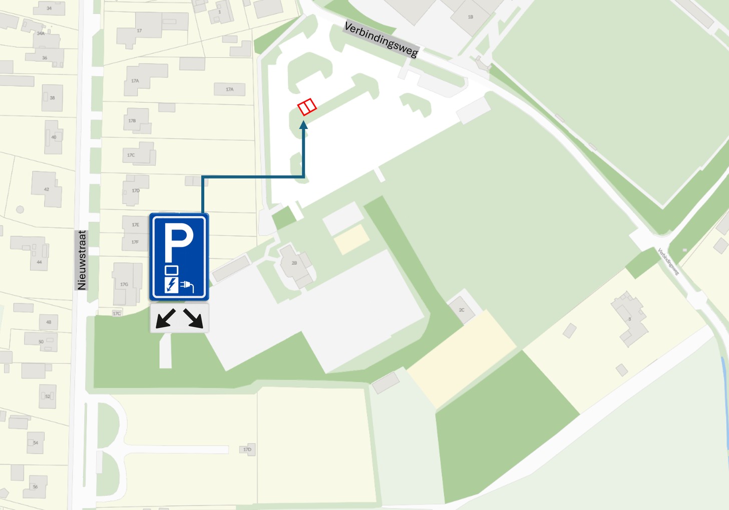 1. Door middel van het plaatsen van het bord E8c van bijlage 1 van het Reglement Verkeersregels en Verkeerstekens 1990 met een onderbord (OB504) die met twee pijlen aangeeft op welke vakken het betrekking heeft, twee parkeerplaatsen te reserveren ten behoeve van het opladen van elektrische voertuigen op de volgende locatie: