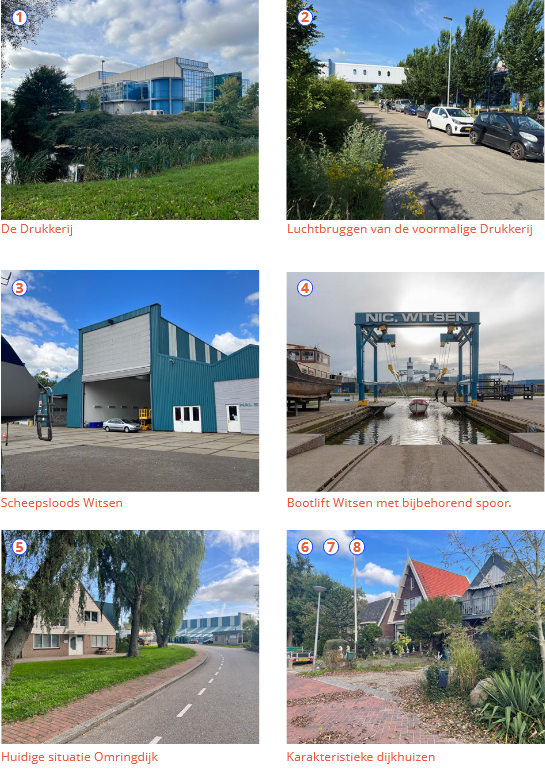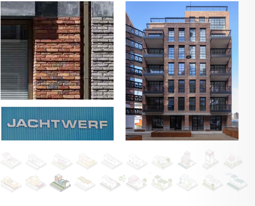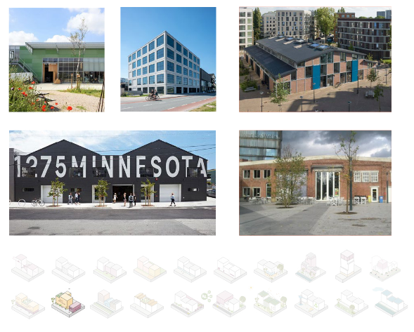 Historische verwijzingen en bedrijfsgebouwen worden gekoesterd en gecombineerd met nieuwe toevoegingen. Karakteristieke elementen van het huidige bedrijventerrein worden omarmd en teruggebracht als drager en herkenbare structuur in de nieuwbouw. Gedacht kan worden aan de luchtbruggen (oude TMG-gebouw) en het industrieel materieel van de botenwerf Witsen (de botenhelling en hefboog) en Spaansen (zandbekers). Zo wordt er voortgeborduurd op de eigen identiteit en ontstaan er duurzame toevoegingen aan het stadsdeel met oog op de toekomst.