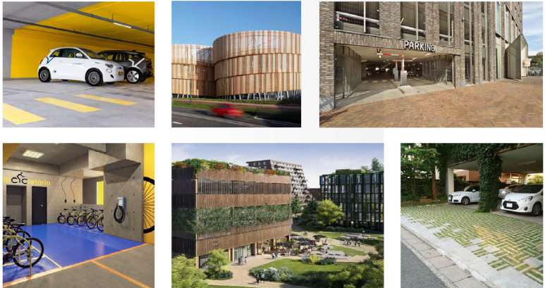 Een andere oplossing is het realiseren van een parkeervoorziening onder een dek. Deze garage wordt omringd door bebouwing, waardoor zij volledig aan het zicht onttrokken is vanaf de straat. Het dek boven de parkeervoorziening wordt ingericht als een groene, verhoogde binnentuin, die fungeert als een rustige en aantrekkelijke buitenruimte voor de omliggende gebouwen.