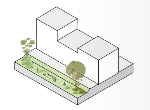 Minstens 20 % van de kavel bevat groen in volle grond ten behoeve van hemelwater infiltratie. Dit oppervlakte ligt verdiept ten opzichte van het peil van de straten.