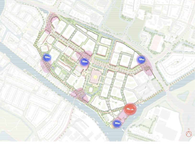 Binnen de meeste ontwikkelclusters kan de mogelijkheid ontstaan om een hoogteaccent toe te passen. Met de juiste positionering en inpassing in de omgeving kunnen deze ondergeschikte accenten een maximale hoogte van 35 meter bereiken. Hierbij is het van belang dat de vormgeving, schaal en materiaalkeuze past bij de directe omgeving en de identiteit van het gebied.