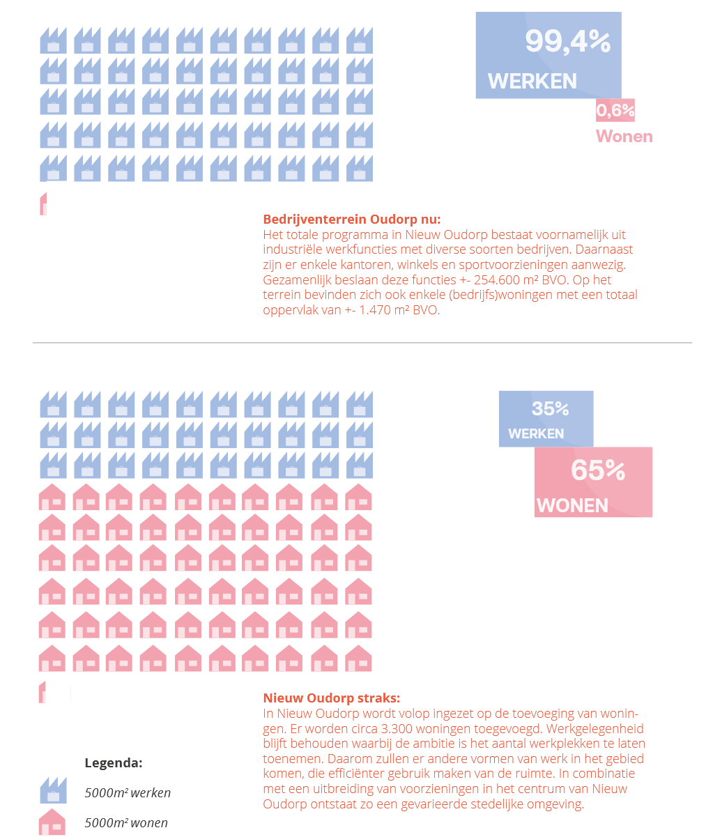 De opgave voor bedrijventerrein Oudorp is de transformatie van een monofunctioneel bedrijventerrein naar een aantrekkelijk, gemengd stedelijk milieu, met ruimte voor wonen en werken, voorzieningen en recreatie. De vitale bedrijvigheid blijft deels aanwezig in Nieuw Oudorp en het op dit moment gesloten bedrijventerrein opent zich voor de stad. In Nieuw Oudorp is in de toekomst sprake van een levendige mix van functies. Het Ontwikkelkader gaat uit van de realisatie van maximaal 3.300 woningen. Voor de samenstelling van het woonprogramma wordt uitgegaan van het gemeentelijk woonbeleid.