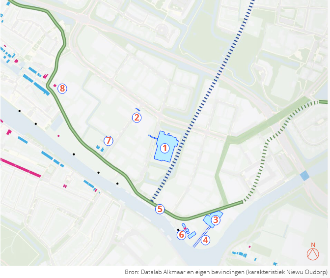 Ondanks de rijke geschiedenis van het gebied zijn er slechts beperkte cultuurhistorische elementen aanwezig. De Westfriese Omringdijk, hoewel een provinciaal monument, is door de huidige inrichting niet goed herkenbaar. De originele dijk is verdwenen voor de aanleg van het bedrijventerrein. Langs de dijk staan enkele beeldbepalende en monumentale woningen. De Drukkerij met de luchtbruggen en de scheepswerf zijn karakteristiek voor Nieuw Oudorp.