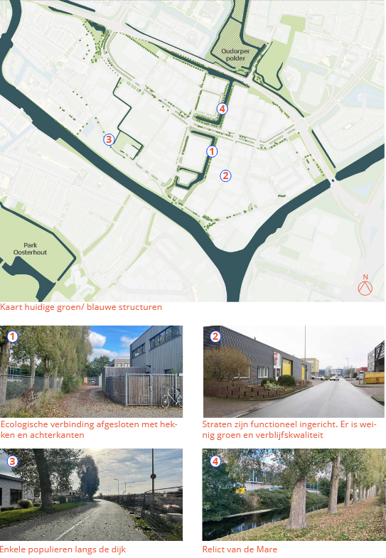 In het midden van het gebied bevindt zich een waterverbinding met groene oevers waarin onder andere de Drukkerij staat. Dit is een mogelijke groene verbinding tussen de Oudorper polder en park Ooster-hout.