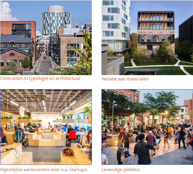 Een stoer en industrieel stedelijk weefsel wordt afgewisseld met karakteristieke kleinschalige elementen. De stedelijkheid wordt gecombineerd met een luchtige groene setting, waardoor er zowel bruisende als rustige plekken ontstaan waar mensen kunnen samenkomen of zich juist terugtrekken.