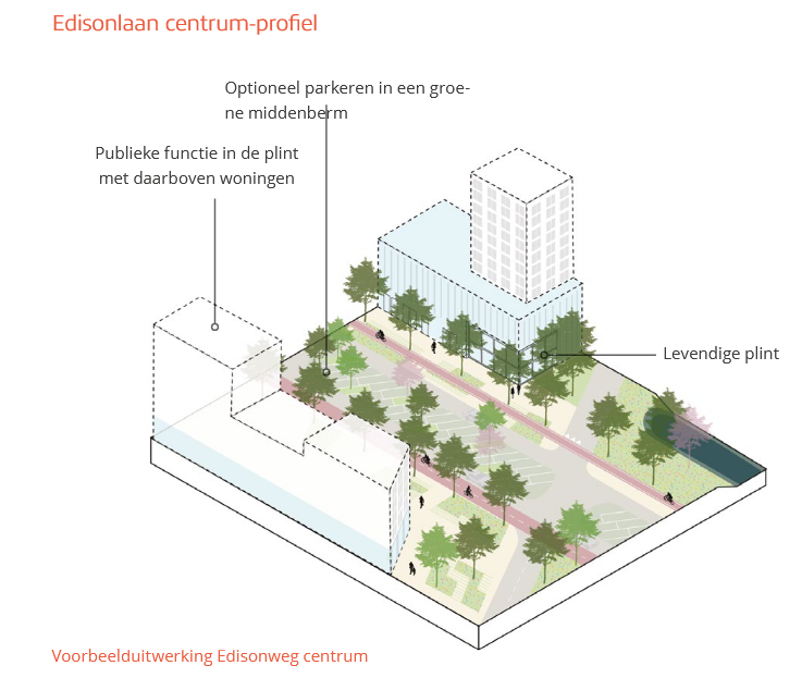Het gebied zal een mix van wonen en werken bieden, met de focus op het levendig maken van de Edi-sonweg, het centrum en de magneetlocatie. Langs de Edisonweg wordt het werkprogramma geconcen-treerd, waarbij de plinten volledig worden gevuld met werkfuncties. In het centrum wordt een gevarieerd programma gestimuleerd, met o.a. horeca, sport, cultuur, zorg, onderwijs en dagelijkse voorzieningen. In de rest van de wijk kan bedrijvigheid landen en blijven die goed mengbaar is met de woonfunctie. Voor de magneetlocatie wordt een publiekstrekkende functie gestimuleerd. De oostzijde van het gebied is recent vernieuwd en zal naar verwachting voorlopig werkgebied blijven.
