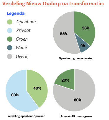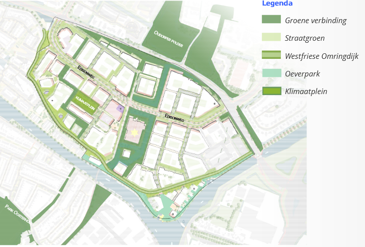 Uitgangspunt is het vergroenen van bestaande structuren waardoor versnipperde groene zones verbonden worden. Zo wordt bijvoorbeeld de Oudorper polder verbonden met Park Oosterhout door een versterkte groene zone. De Westfriese Omringdijk krijgt een groenere uitstraling met toegevoegde bomen, waardoor het weer herkenbaar wordt als landschappelijke structuur. De oever van het kanaal wordt (waar mogelijk) openbaar toegankelijk gemaakt als onderdeel van het Kanaalpark Alkmaar. Samen met de parken en vergroende straten, transformeert Nieuw Oudorp van een verhard werkgebied naar een groene woon-werkomgeving.