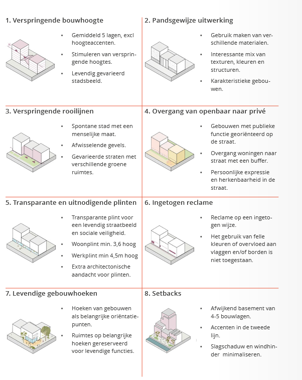 Bij de architectonische uitwerkingen is het noodzakelijk om extra aandacht te besteden aan de plinten van de gebouwen. Woonplinten krijgen bij appartementen een minimale hoogte van 3,6 meter. Werkplinten zijn minimaal 4,5 meter hoog.