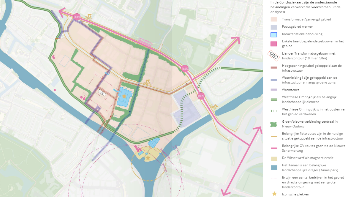 Dit hoofdstuk begint met een Conclusiekaart gebaseerd op verschillende thema’s. De onderliggende analyse resulteert in een overzicht van de bestaande kwaliteiten, randvoorwaarden en de kansen van het gebied. De gebiedsontwikkeling biedt een kans om bestaande kwaliteiten van Nieuw Oudorp te versterken en om knelpunten op te lossen.