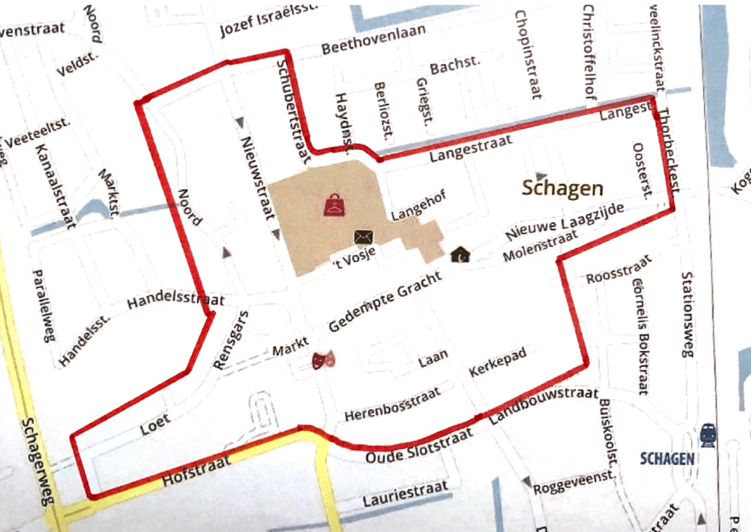 Het gebied Binnenstad Schagen omvat het gebied zoals hieronder afgebeeld.