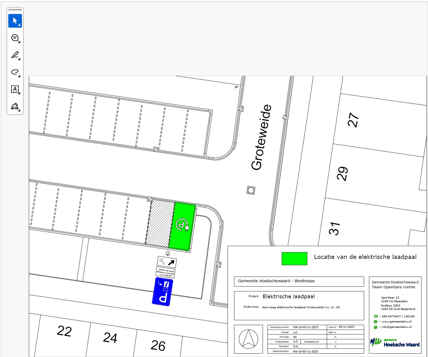 Twee parkeerplaatsen aan te wijzen voor het uitsluitend opladen van elektrische voertuigen, waarbij aanvankelijk slechts één parkeerplaats wordt geëffectueerd. Dit door middel van het plaatsen van het bord E8c van het RVV (Reglement Verkeersregels en Verkeerstekens 1990) voorzien van het onderbord met de tekst ” Uitsluitend voor elektrische voertuigen tijdens het opladen”.
