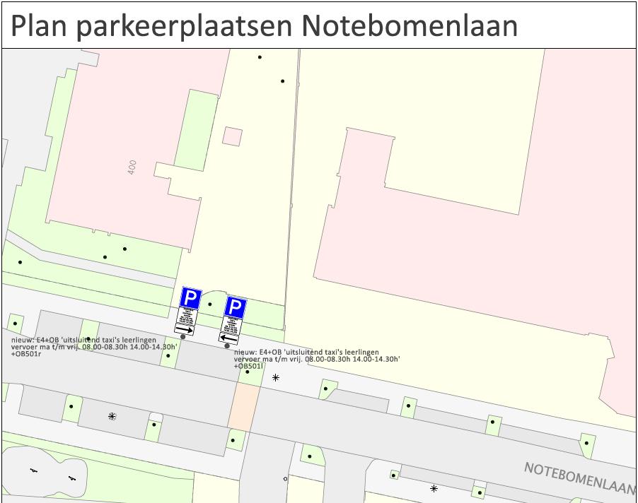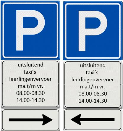 Vaststellen: Parkeergelegenheid, van ma. t/m vr. van 08.00 tot 08.30 en van 14.00 tot 14.30 uur uitsluitende bestemd voor taxi voor leerlingenvervoer ( bord E4 conform Bijlage 1 van het RVV 1990 met onderborden OB501l en OB501r)