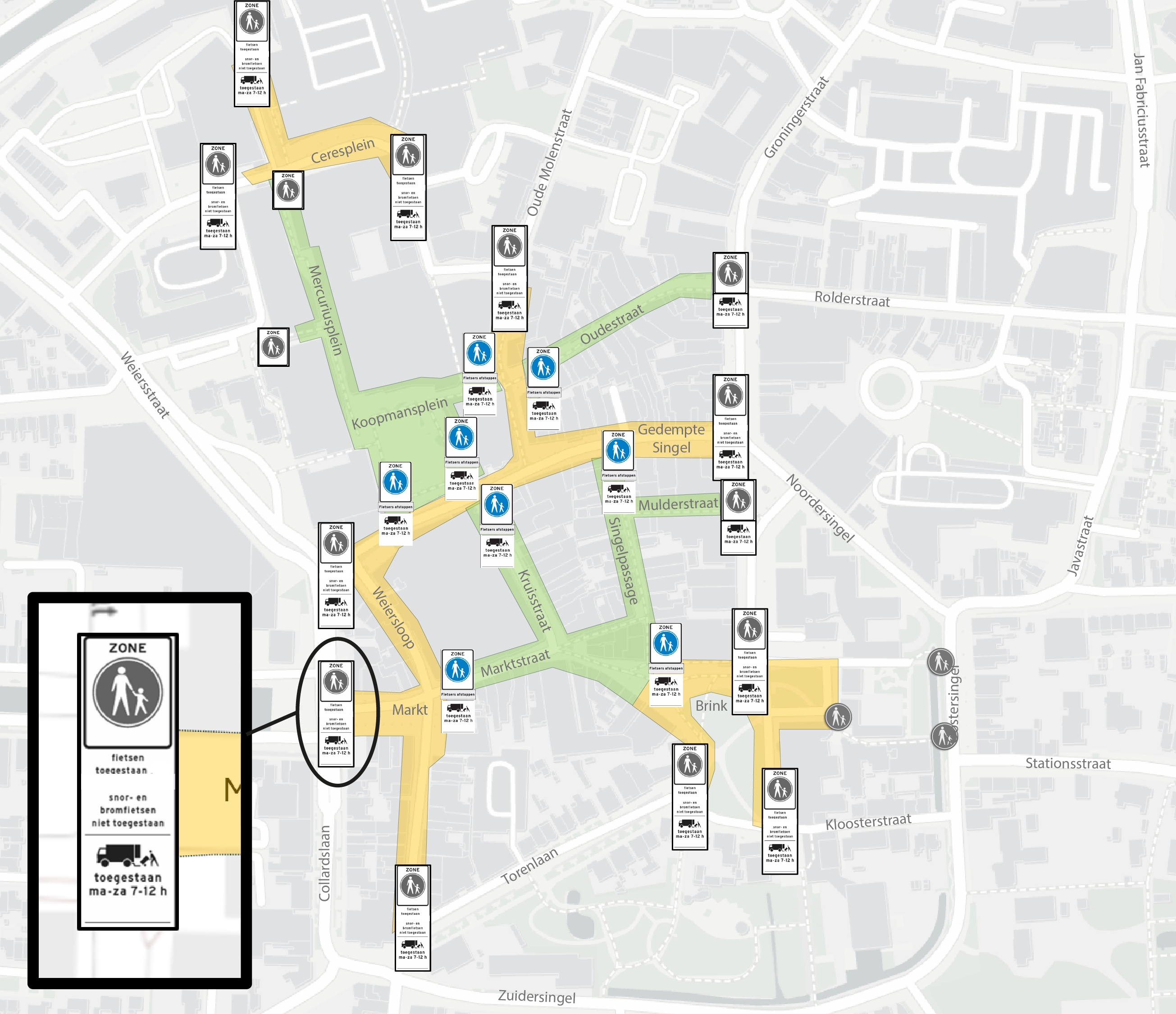 Het vervangen van de onderborden met de tekst “fietsen toegestaan op aangegeven strook” door onderborden met de tekst “fietsen toegestaan” op alle overige entrees van het voetgangersgebied waar fietsen is toegestaan (Markt, Weierspoort, Kerkstraat, Brink, Gedempte Singel, Apollopad, Ceresplein, Oude Molenstraat).