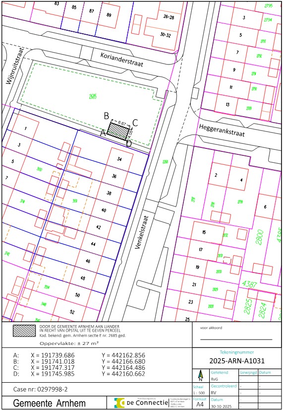 Liander N.V. is voornemens aan de Venkelstraat/hoek Korianderstraat, kadastraal bekend gemeente Arnhem, sectie E nummer 2685 (gedeeltelijk), een MSR te realiseren ten behoeve van de stroomvoorziening van het omliggende gebied. De MSR dient te worden gerealiseerd op een gedeelte van de locatie zoals aangegeven op bijgaande tekening met nummer 2025-ARN-A1031. Liander heeft om deze reden verzocht tot vestiging van een opstalrecht op deze locatie (circa 27 m2) ten behoeve van Liander.