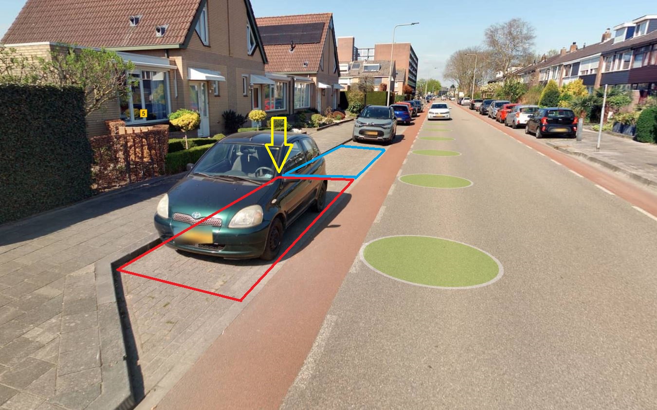 Blauwe markering= Besluit punt 2: In de toekomst mogelijk te realiseren extra parkeervak voor opladen elektrische voertuigen. Geel=aangewezen locatie voor oplaadpaal bord E8c met onderbord)