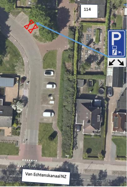 Door plaatsing van het verkeersbord model E8c met het onderbord OB504, reserveren we twee parkeervakken voor het opladen van elektrische voertuigen nabij de volgende adressen: