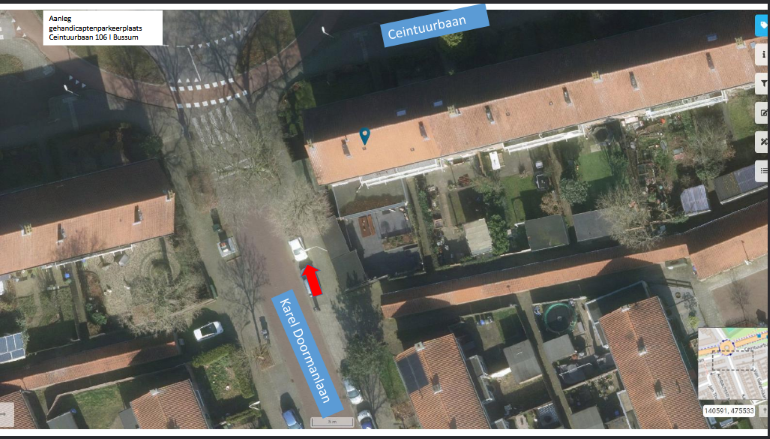 De gemeente Gooise Meren heeft naar aanleiding van een verzoek van een bewoner besloten om met behulp van een kenteken een gehandicaptenparkeerplaats voor de bewoner te reserveren ter hoogte van de woning met het adres Ceintuurbaan 106, 1403AG Bussum. Op de situatietekening staat de beoogde locatie van de te reserveren parkeerplaats weergegeven.