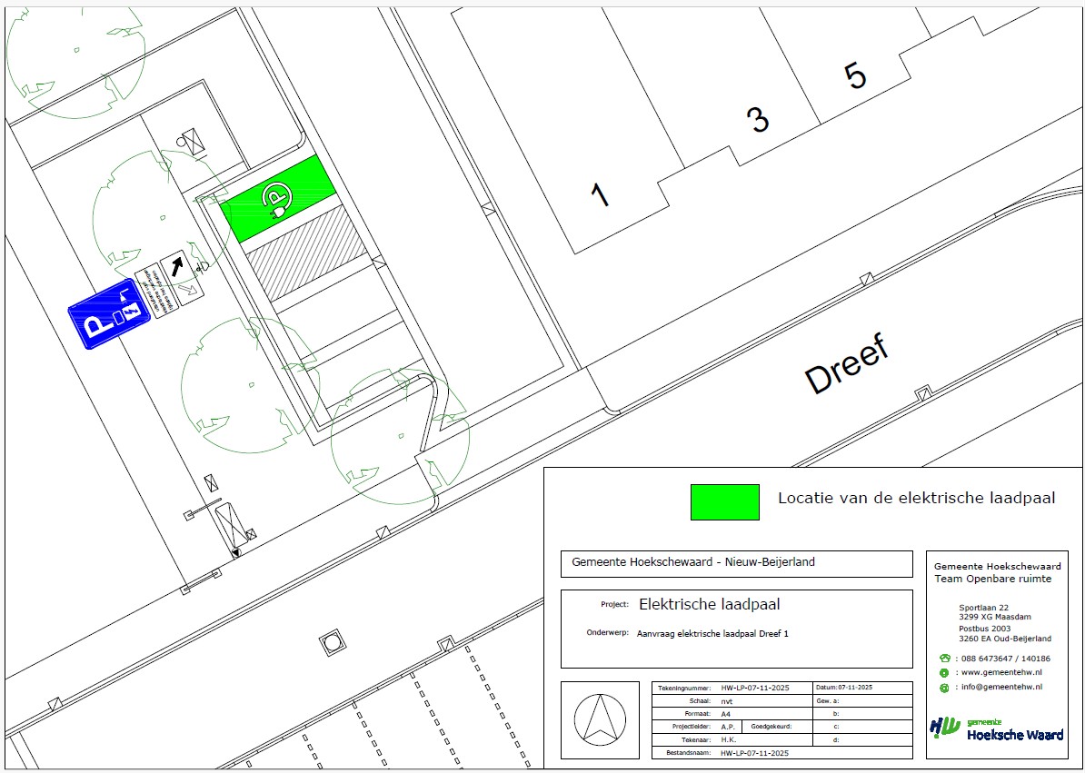 Twee parkeerplaatsen aan te wijzen voor het uitsluitend opladen van elektrische voertuigen, waarbij aanvankelijk slechts één parkeerplaats wordt geëffectueerd. Dit door middel van het plaatsen van het bord E8c van het RVV (Reglement Verkeersregels en Verkeerstekens 1990) voorzien van het onderbord met de tekst ” Uitsluitend voor elektrische voertuigen tijdens het opladen”.