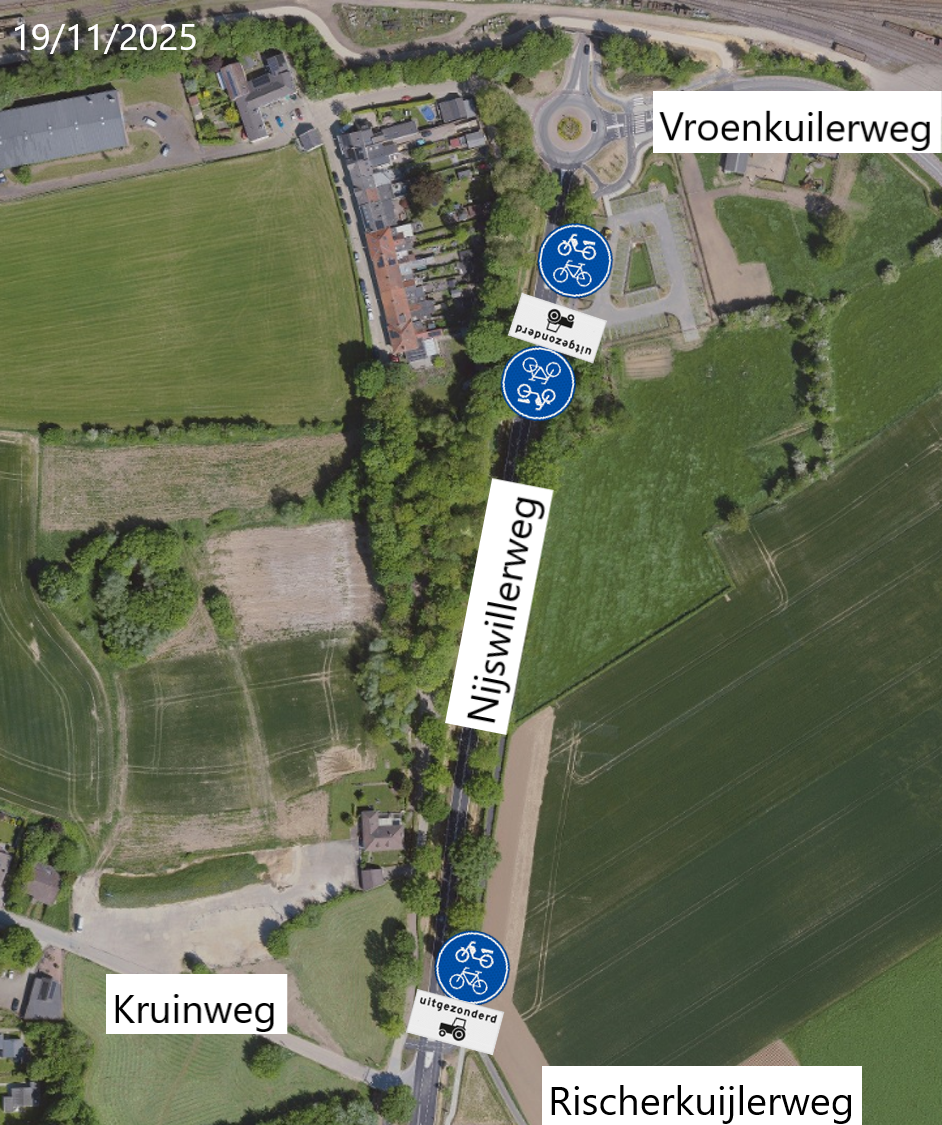 Deze verkeersmaatregel wordt gerealiseerd middels het plaatsen van de borden G12a (verplicht fiets/bromfietspad) en de onderborden OB55 (uitgezonderd landbouwverkeer) in de Nijswillerweg volgens bijgevoegde tekening. Het betreft 3x het plaatsen van het bord G12a en 2x het onderbord OB55.