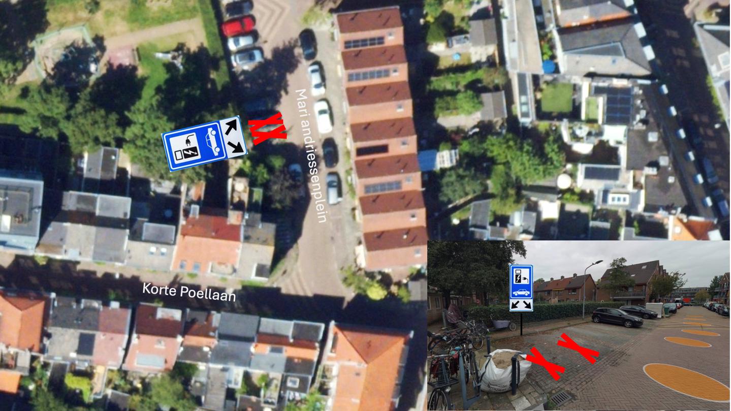 door middel van het plaatsen van het verkeersbord conform model E8c van bijlage 1 van het RVV 1990 met een onderbord OB504 met pijlen, waaruit blijkt dat het bord voor twee parkeerplaatsen van toepassing is – in het Mari Andriessenplein nabij no.56, een tweetal parkeerplaatsen te reserveren die alleen bestemd zijn voor het opladen van elektrische voertuigen.